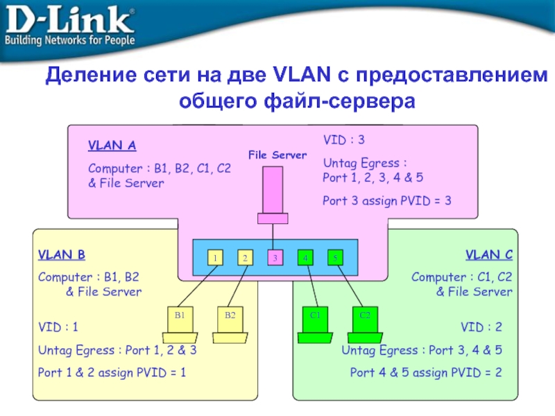 Слайд 17Деление сети на две VLAN с предоставлением общего файл-сервера