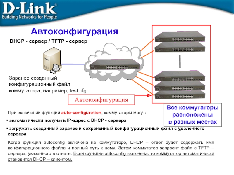 Включите функцию “auto-configuration”, коммутатор автоматически получит IP-адрес и связанные с ним IP-адрес TFTP – сервера и имя конфигурационного файла с DHCP – сервера, сохранит информацию и перезагрузится. После загрузки коммутатора, он обратится к TFTP – серверу для загрузки конфигурационного файла.