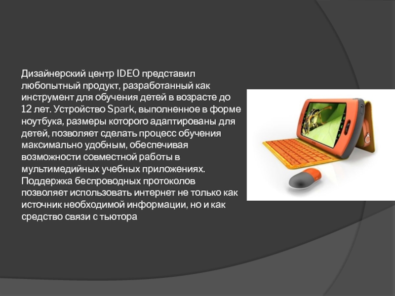 детей в возрасте до 12 лет. Устройство Spark, выполненное в форме ноутбука, размеры которого адаптированы для детей, позволяет сделать процесс обучения максимально удобным, обеспечивая возможности совместной работы в мультимедийных учебных приложениях. Поддержка беспроводных протоколов позволяет использовать интернет не только как источник необходимой информации, но и как средство связи с тьютора
