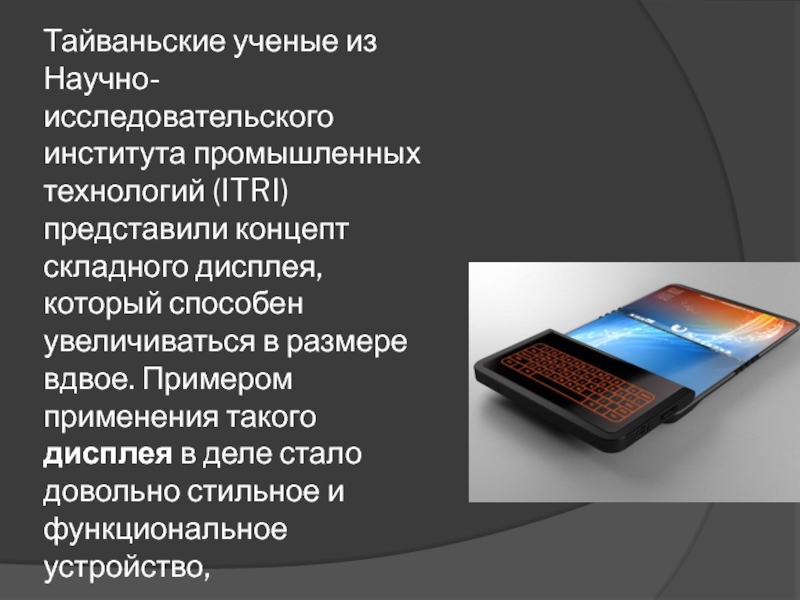 Слайд 3Тайваньские ученые из Научно-исследовательского института промышленных технологий (ITRI) представили концепт складного