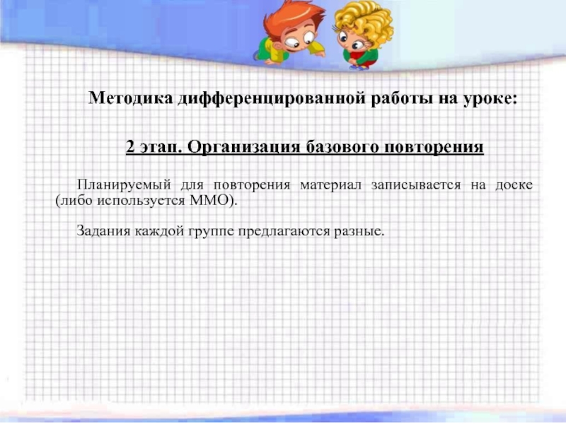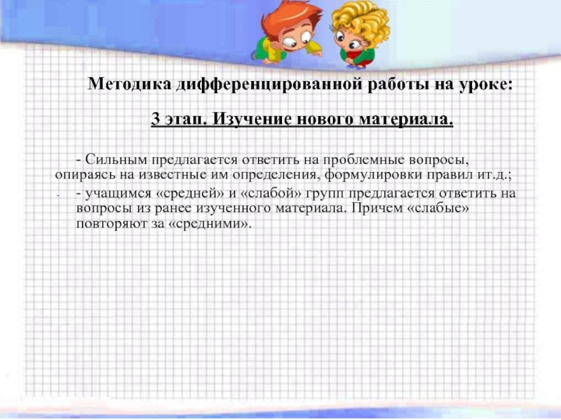 - учащимся «средней» и «слабой» групп предлагается ответить на вопросы из ранее изученного материала. Причем «слабые» повторяют за «средними».