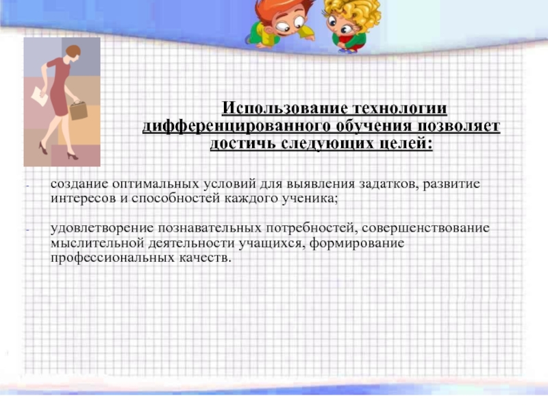 Слайд 3Использование технологии дифференцированного обучения позволяет достичь следующих целей: