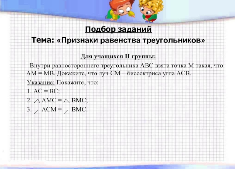 Внутри равностороннего треугольника ABC взята точка М такая, что АМ = МВ. Докажите, что луч СМ – биссектриса угла АСВ.