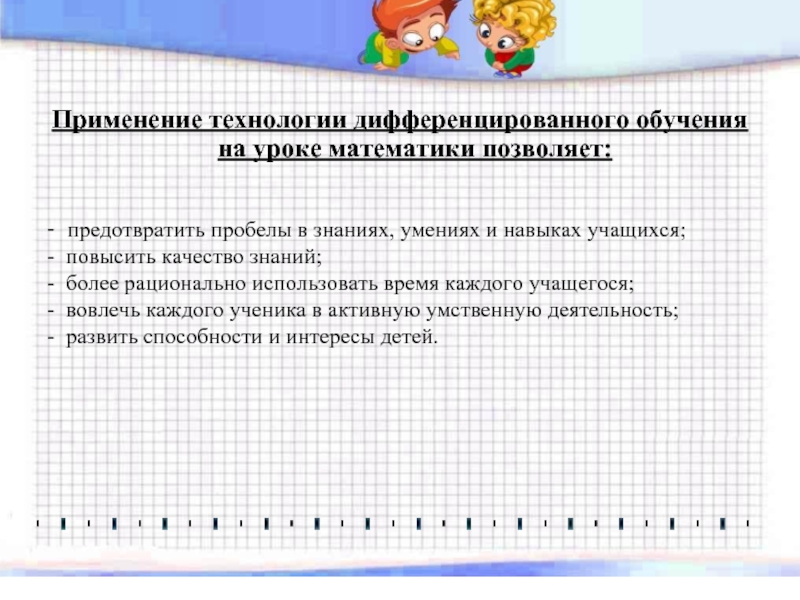 Слайд 25Применение технологии дифференцированного обучения на уроке математики позволяет: