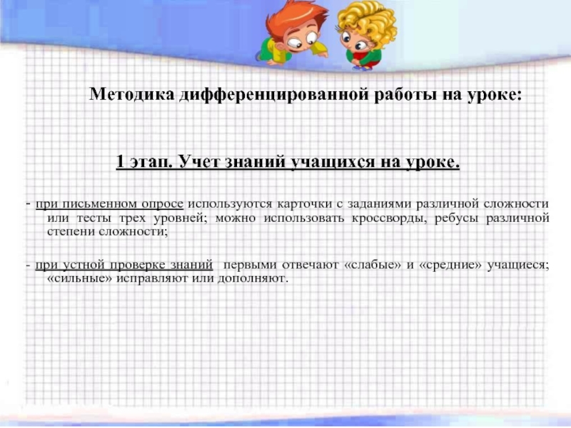 при письменном опросе используются карточки с заданиями различной сложности или тесты трех уровней; можно использовать кроссворды, ребусы различной степени сложности;