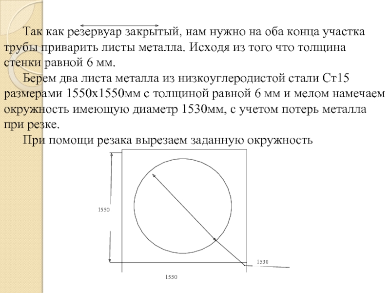 Берем два листа металла из низкоуглеродистой стали Ст15 размерами 1550x1550мм с толщиной равной 6 мм и мелом намечаем окружность имеющую диаметр 1530мм, с учетом потерь металла при резке.