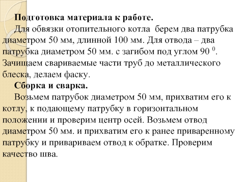 50 мм, длинной 100 мм. Для отвода – два патрубка диаметром 50 мм. с загибом под углом 90 0. Зачищаем свариваемые части труб до металлического блеска, делаем фаску.