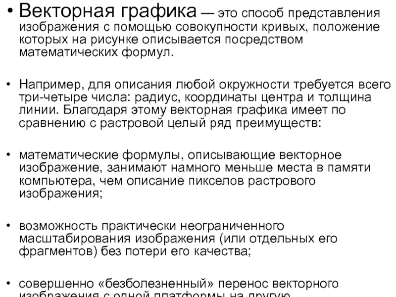 математические формулы, описывающие векторное изображение, занимают намного меньше места в памяти компьютера, чем описание пикселов растрового изображения;