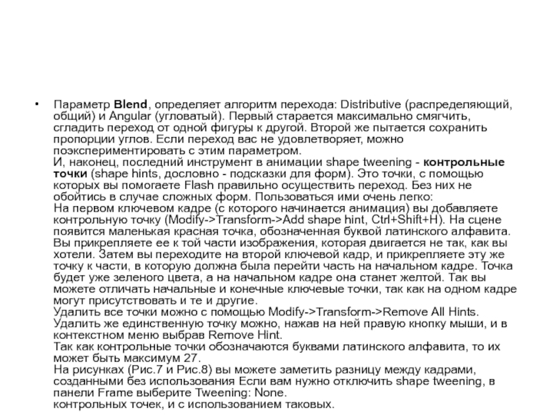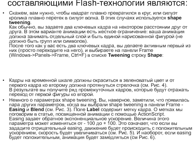 На рисунках (Рис.7 и Рис.8) вы можете заметить разницу между кадрами, созданными без использования Если вам нужно отключить shape tweening, в панели Frame выберите Tweening: None.