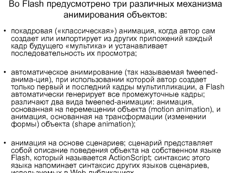 Слайд 6Во Flash предусмотрено три различных механизма анимирования объектов: