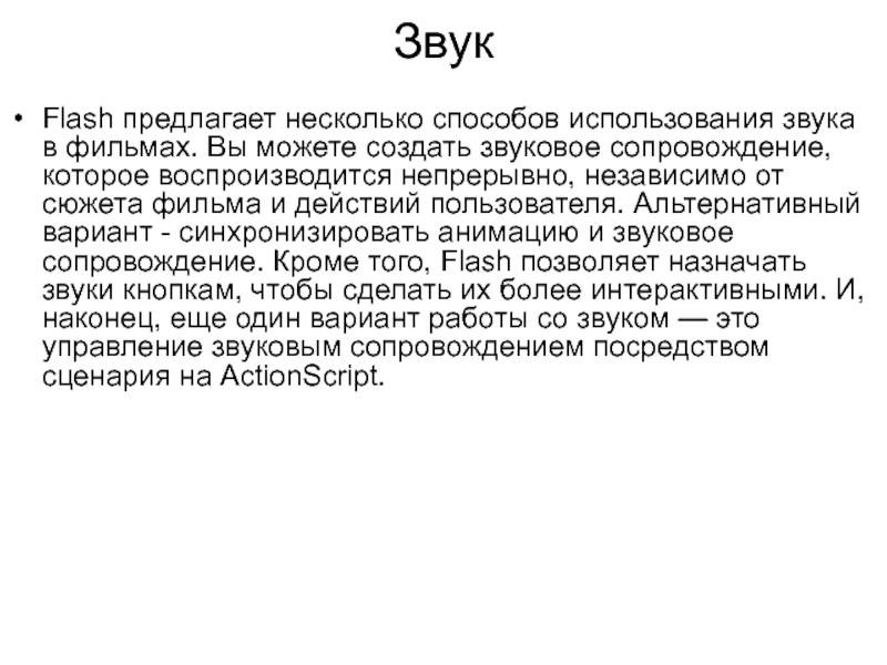 звуковое сопровождение, которое воспроизводится непрерывно, независимо от сюжета фильма и действий пользователя. Альтернативный вариант - синхронизировать анимацию и звуковое сопровождение. Кроме того, Flash позволяет назначать звуки кнопкам, чтобы сделать их более интерактивными. И, наконец, еще один вариант работы со звуком — это управление звуковым сопровождением посредством сценария на ActionScript.