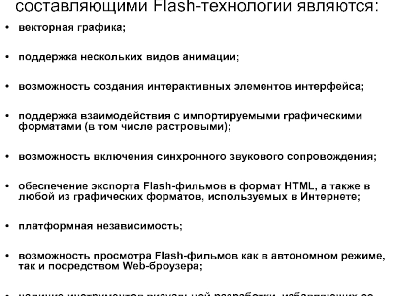 наличие инструментов визуальной разработки, избавляющих со-здателя Flash-фильмов от многих рутинных операций, а также от детального изучения технических аспектов реализации Flash-технологии.