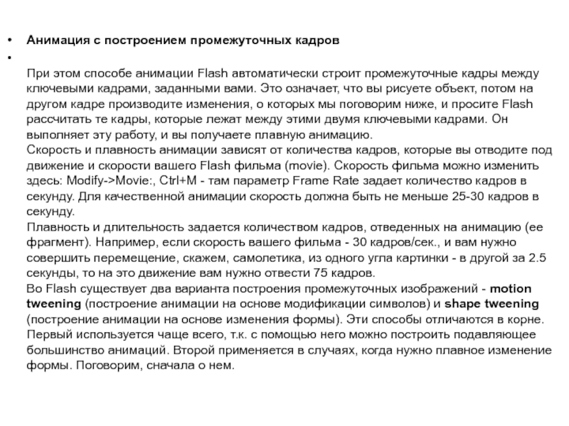автоматическое анимирование (так называемая tweened-анима-ция), при использовании которой автор создает только первый и последний кадры мультипликации, a Flash автоматически генерирует все промежуточные кадры; различают два вида tweened-анимации: анимация, основанная на перемещении объекта (motion animation), и анимация, основанная на трансформации (изменении формы) объекта (shape animation);