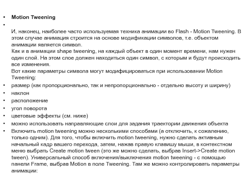 Вот какие параметры символа могут модифицироваться при использовании Motion Tweening:
