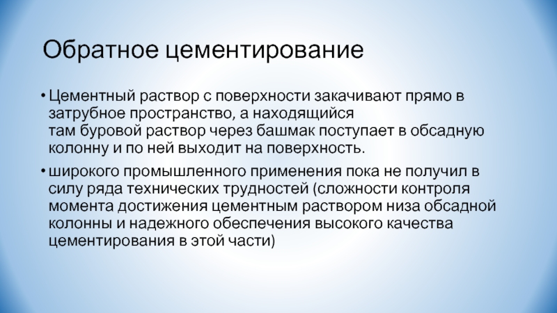 широкого промышленного применения пока не получил в силу ряда технических трудностей (сложности контроля момента достижения цементным раствором низа обсадной колонны и надежного обеспечения высокого качества цементирования в этой части)