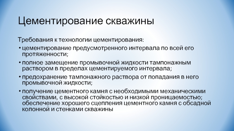 получение цементного камня с необходимыми механическими свойствами, с высокой стойкостью и низкой проницаемостью; обеспечение хорошего сцепления цементного камня с обсадной колонной и стенками скважины