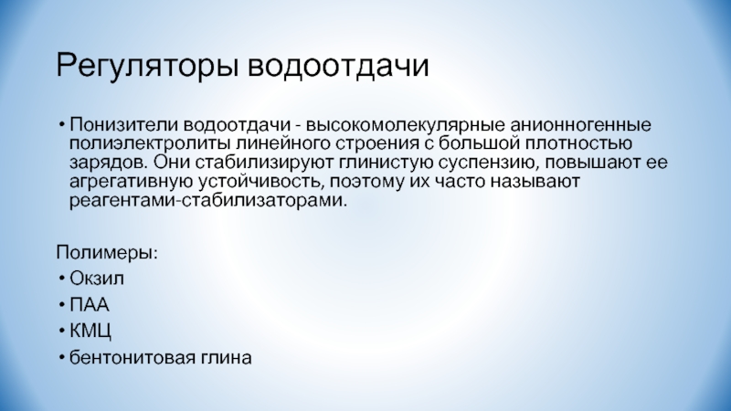 Понизители водоотдачи - высокомолекулярные анионногенные полиэлектролиты линейного строения с большой