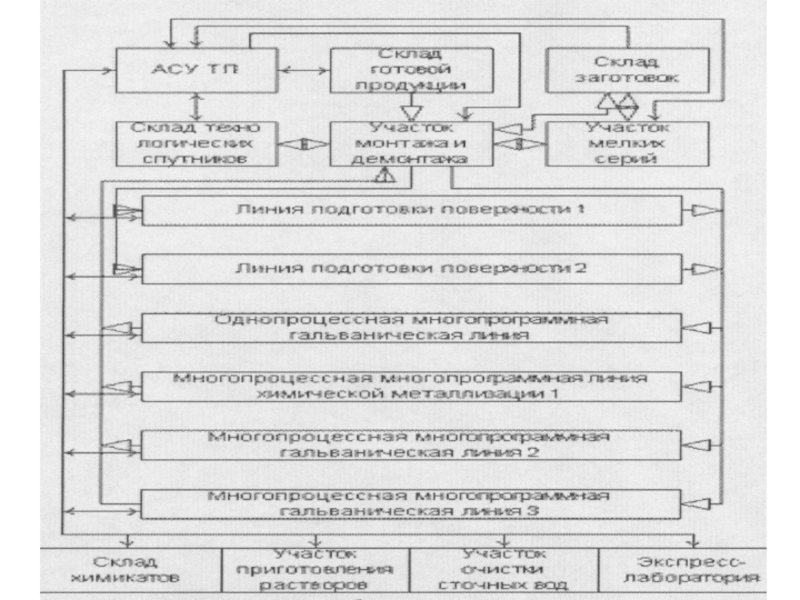 уровне ода или цеха, в котором отражается специализация участков, выбор систем управления и вычислительной техники, создания единых транспортно-накопительных потоков и т. п., а внедрение проводится поэтапно - по модулям, линиям, участкам. Типовая структура ГАП ПП приведена на рисунке.