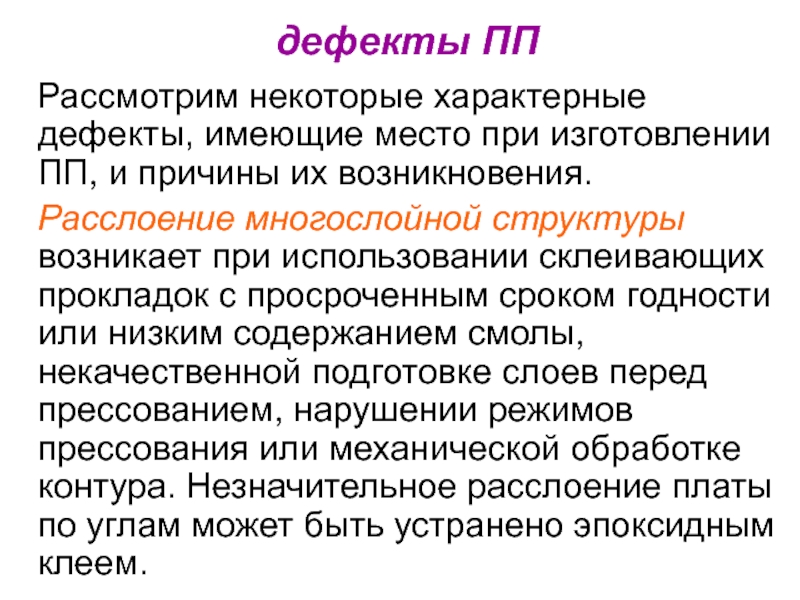 Расслоение многослойной структуры возникает при использовании склеивающих прокладок с просроченным сроком годности или низким содержанием смолы, некачественной подготовке слоев перед прессованием, нарушении режимов прессования или механической обработке контура. Незначительное расслоение платы по углам может быть устранено эпоксидным клеем.