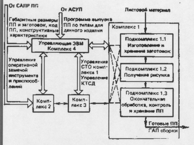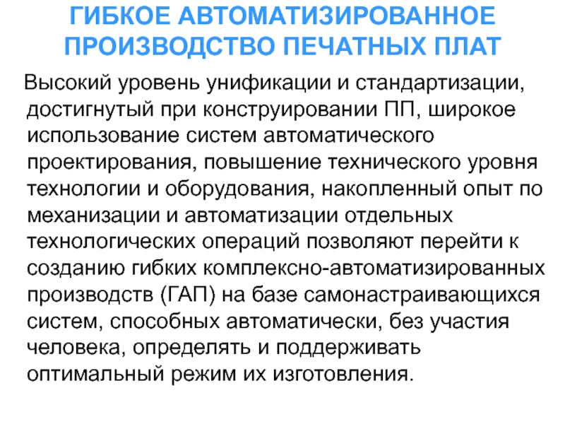 достигнутый при конструировании ПП, широкое использование систем автоматического проектирования, повышение технического уровня технологии и оборудования, накопленный опыт по механизации и автоматизации отдельных технологических операций позволяют перейти к созданию гибких комплексно-автоматизированных производств (ГАП) на базе самонастраивающихся систем, способных автоматически, без участия человека, определять и поддерживать оптимальный режим их изготовления.
