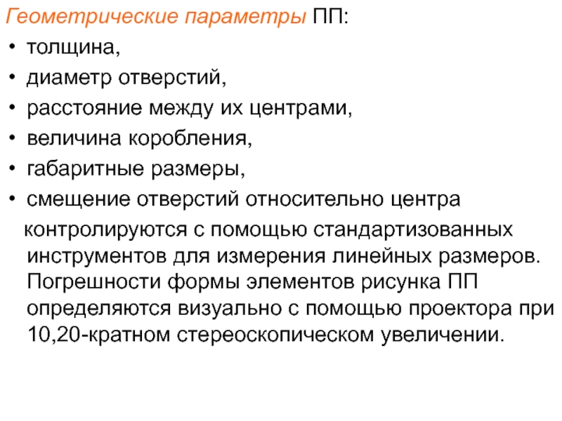 контролируются с помощью стандартизованных инструментов для измерения линейных размеров. Погрешности формы элементов рисунка ПП определяются визуально с помощью проектора при 10,20-кратном стереоскопическом увеличении.