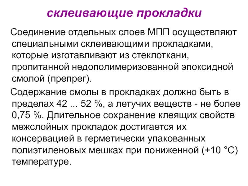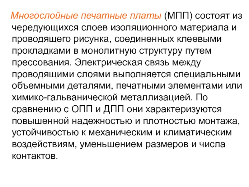 материала и проводящего рисунка, соединенных клеевыми прокладками в монолитную структуру путем прессования. Электрическая связь между проводящими слоями выполняется специальными объемными деталями, печатными элементами или химико-гальванической металлизацией. По сравнению с ОПП и ДПП они характеризуются повышенной надежностью и плотностью монтажа, устойчивостью к механическим и климатическим воздействиям, уменьшением размеров и числа контактов.