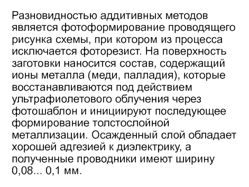 котором из процесса исключается фоторезист. На поверхность заготовки наносится состав, содержащий ионы металла (меди, палладия), которые восстанавливаются под действием ультрафиолетового облучения через фотошаблон и инициируют последующее формирование толстослойной металлизации. Осажденный слой обладает хорошей адгезией к диэлектрику, а полученные проводники имеют ширину 0,08... 0,1 мм.
