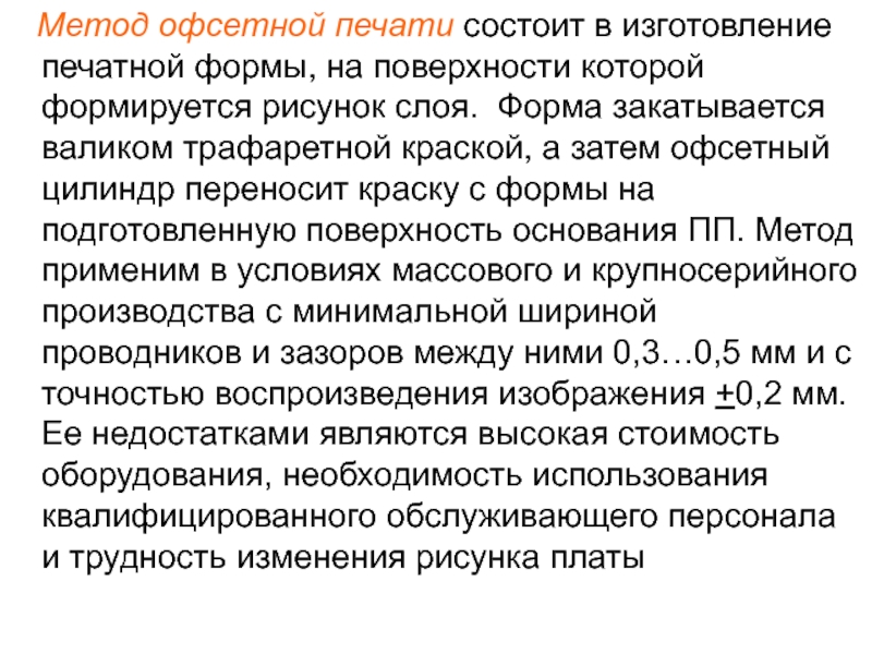 поверхности которой формируется рисунок слоя. Форма закатывается валиком трафаретной краской, а затем офсетный цилиндр переносит краску с формы на подготовленную поверхность основания ПП. Метод применим в условиях массового и крупносерийного производства с минимальной шириной проводников и зазоров между ними 0,3…0,5 мм и с точностью воспроизведения изображения +0,2 мм. Ее недостатками являются высокая стоимость оборудования, необходимость использования квалифицированного обслуживающего персонала и трудность изменения рисунка платы