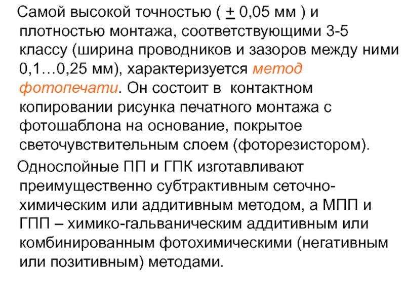 Однослойные ПП и ГПК изготавливают преимущественно субтрактивным сеточно-химическим или аддитивным методом, а МПП и ГПП – химико-гальваническим аддитивным или комбинированным фотохимическими (негативным или позитивным) методами.