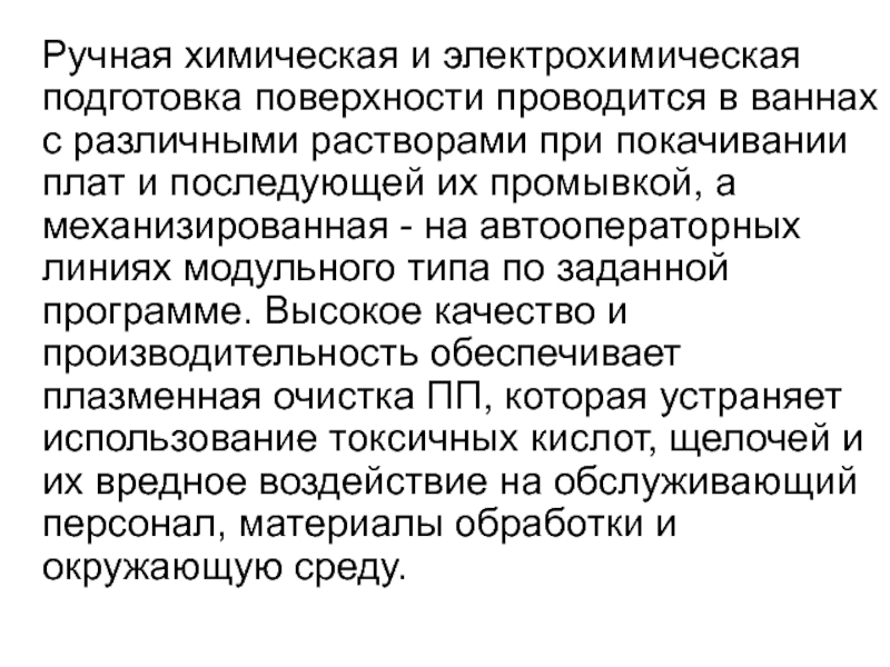 с различными растворами при покачивании плат и последующей их промывкой, а механизированная - на автооператорных линиях модульного типа по заданной программе. Высокое качество и производительность обеспечивает плазменная очистка ПП, которая устраняет использование токсичных кислот, щелочей и их вредное воздействие на обслуживающий персонал, материалы обработки и окружающую среду.