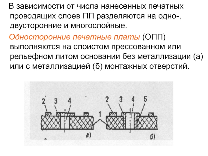Односторонние печатные платы (ОПП) выполняются на слоистом прессованном или рельефном литом основании без металлизации (а) или с металлизацией (б) монтажных отверстий.