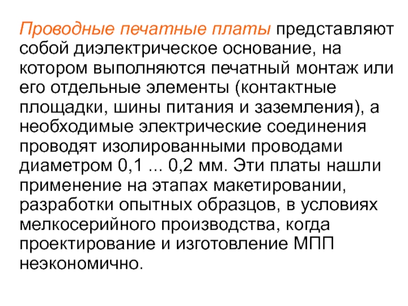 выполняются печатный монтаж или его отдельные элементы (контактные площадки, шины питания и заземления), а необходимые электрические соединения проводят изолированными проводами диаметром 0,1 ... 0,2 мм. Эти платы нашли применение на этапах макетировании, разработки опытных образцов, в условиях мелкосерийного производства, когда проектирование и изготовление МПП неэкономично.