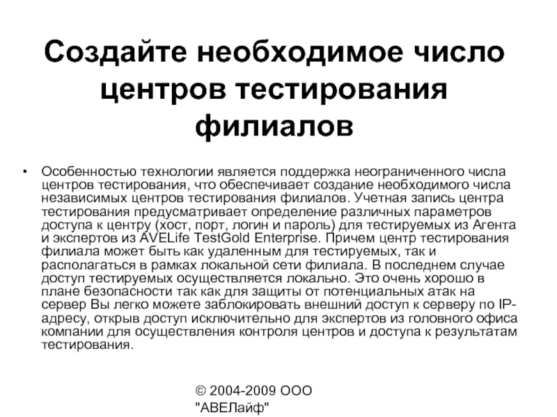 является поддержка неограниченного числа центров тестирования, что обеспечивает создание необходимого числа независимых центров тестирования филиалов. Учетная запись центра тестирования предусматривает определение различных параметров доступа к центру (хост, порт, логин и пароль) для тестируемых из Агента и экспертов из AVELife TestGold Enterprise. Причем центр тестирования филиала может быть как удаленным для тестируемых, так и располагаться в рамках локальной сети филиала. В последнем случае доступ тестируемых осуществляется локально. Это очень хорошо в плане безопасности так как для защиты от потенциальных атак на сервер Вы легко можете заблокировать внешний доступ к серверу по IP-адресу, открыв доступ исключительно для экспертов из головного офиса компании для осуществления контроля центров и доступа к результатам тестирования.