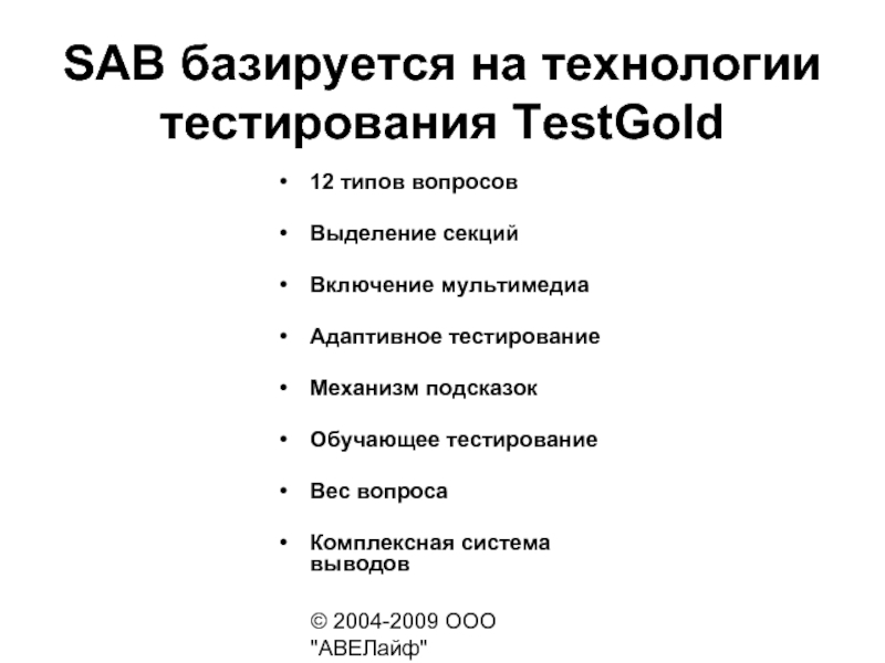 тестирования TestGold на сайте компании АВЕЛайф http://avelife.ru/, на странице http://avelife.ru/products/testgold/features.htm.