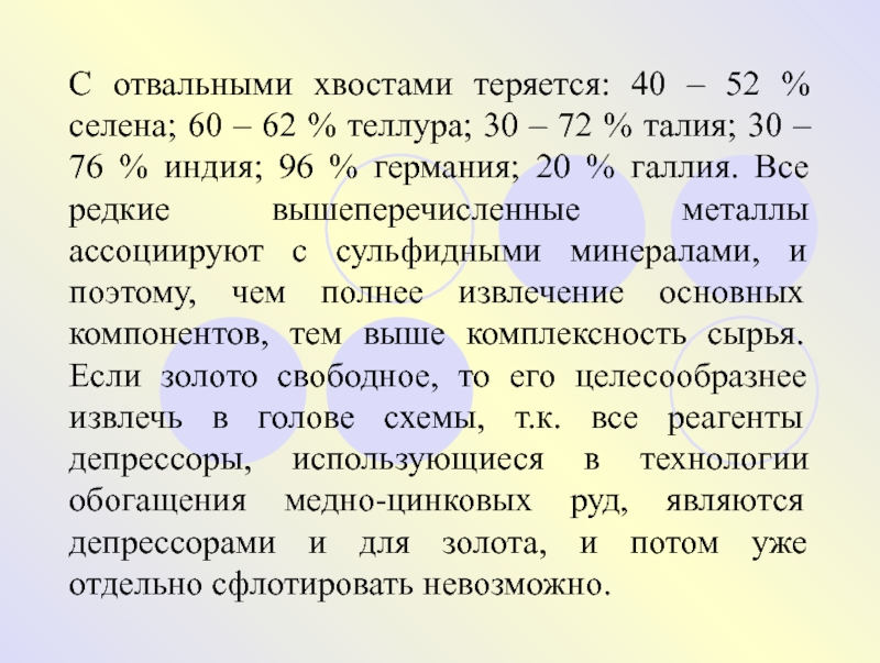 62 % теллура; 30 – 72 % талия; 30 – 76 % индия; 96 % германия; 20 % галлия. Все редкие вышеперечисленные металлы ассоциируют с сульфидными минералами, и поэтому, чем полнее извлечение основных компонентов, тем выше комплексность сырья. Если золото свободное, то его целесообразнее извлечь в голове схемы, т.к. все реагенты депрессоры, использующиеся в технологии обогащения медно-цинковых руд, являются депрессорами и для золота, и потом уже отдельно сфлотировать невозможно.