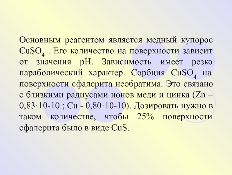 зависит от значения pH. Зависимость имеет резко параболический характер. Сорбция CuSO4 на поверхности сфалерита необратима. Это связано с близкими радиусами ионов меди и цинка (Zn – 0,83·10-10 ; Cu - 0,80·10-10). Дозировать нужно в таком количестве, чтобы 25% поверхности сфалерита было в виде CuS.
