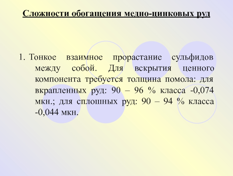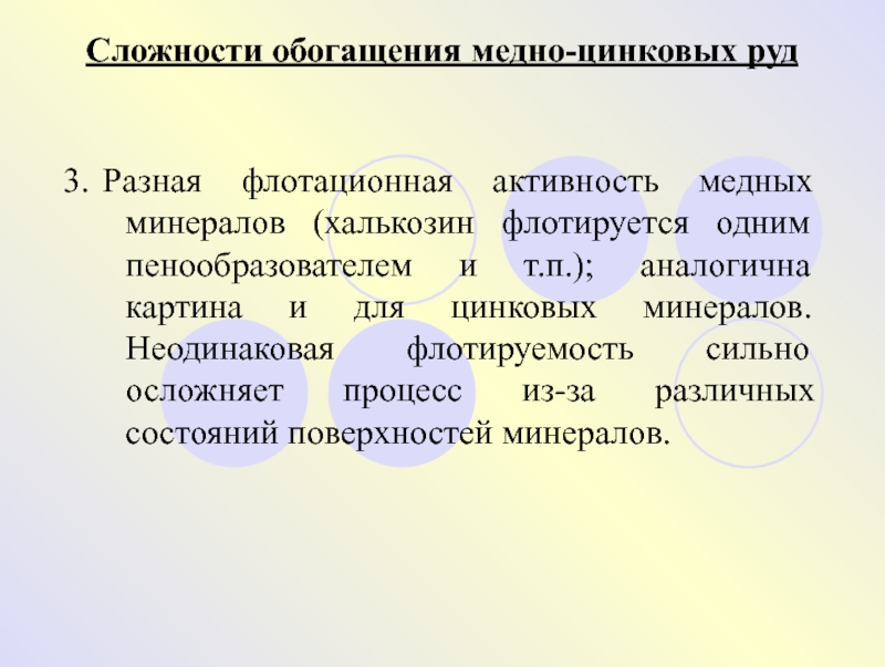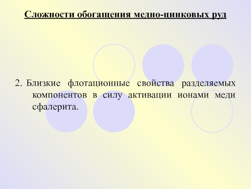 Слайд 72. Близкие флотационные свойства разделяемых компонентов в силу активации ионами меди сфалерита.