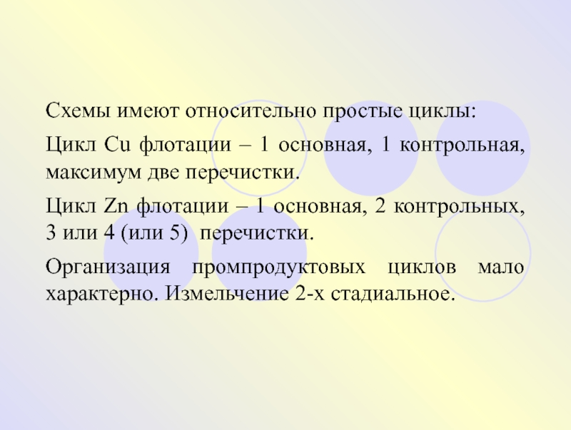 Особенностью этой схемы является организация промпродуктового цикла, а также две операции перечистки коллективного концентрата. Это позволяет отказаться от организации цинкового цикла и получать цинковый концентрат в виде камерного продукта медного цикла.