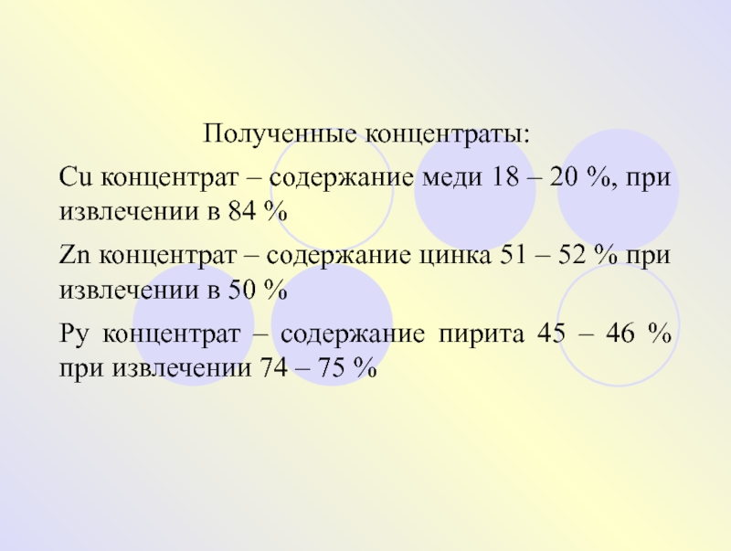 Zn концентрат – содержание цинка 51 – 52 % при извлечении в 50 %