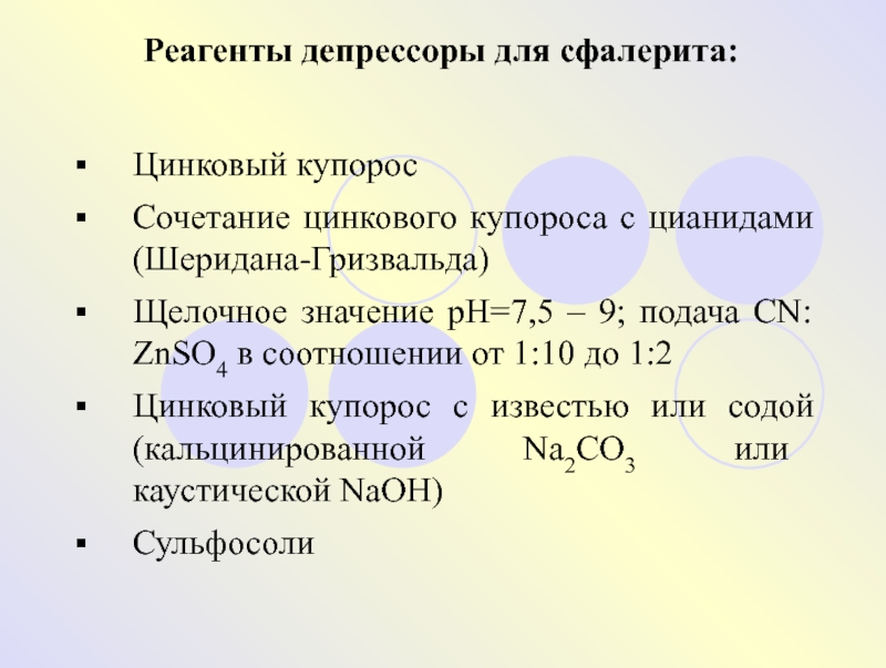 Для депрессии ZnS используется сочетание кальцинированной соды и цинкового купороса: Na2CO3 – 230 (400) г/т; ZnSO4 – 1100 – 1300 г/т.