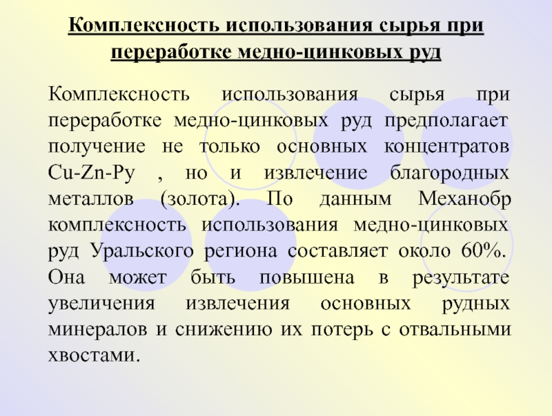 переработке медно-цинковых руд предполагает получение не только основных концентратов Cu-Zn-Py , но и извлечение благородных металлов (золота). По данным Механобр комплексность использования медно-цинковых руд Уральского региона составляет около 60%. Она может быть повышена в результате увеличения извлечения основных рудных минералов и снижению их потерь с отвальными хвостами.