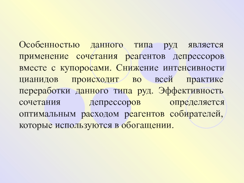 Слайд 15Особенностью данного типа руд является применение сочетания реагентов депрессоров вместе с