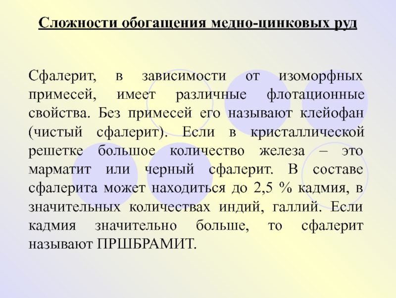 Слайд 9Сфалерит, в зависимости от изоморфных примесей, имеет различные флотационные свойства. Без