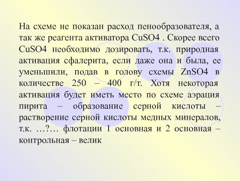 CuSO4 . Скорее всего CuSO4 необходимо дозировать, т.к. природная активация сфалерита, если даже она и была, ее уменьшили, подав в голову схемы ZnSO4 в количестве 250 – 400 г/т. Хотя некоторая активация будет иметь место по схеме аэрация пирита – образование серной кислоты – растворение серной кислоты медных минералов, т.к. …?… флотации 1 основная и 2 основная – контрольная – велик