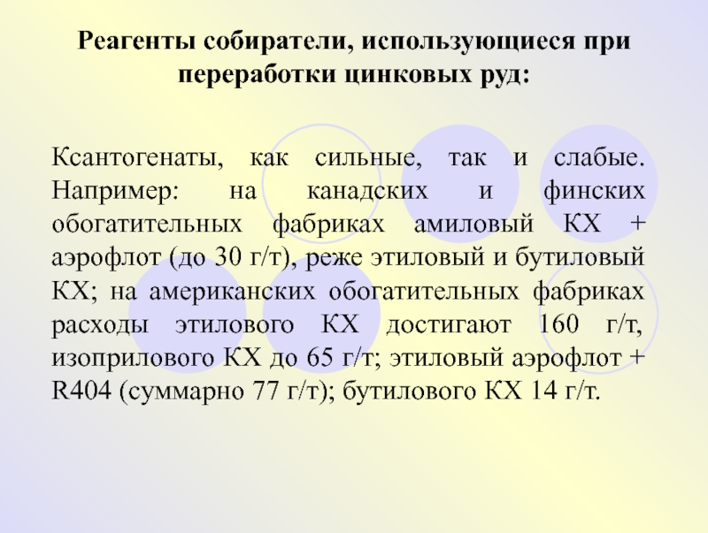 обогатительных фабриках амиловый КХ + аэрофлот (до 30 г/т), реже этиловый и бутиловый КХ; на американских обогатительных фабриках расходы этилового КХ достигают 160 г/т, изоприлового КХ до 65 г/т; этиловый аэрофлот + R404 (суммарно 77 г/т); бутилового КХ 14 г/т.