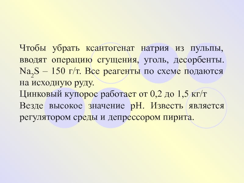 Слайд 36Чтобы убрать ксантогенат натрия из пульпы, вводят операцию сгущения, уголь, десорбенты.