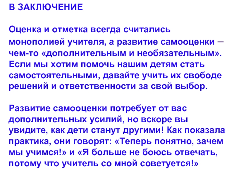Развитие самооценки потребует от вас дополнительных усилий, но вскоре вы увидите, как дети станут другими! Как показала практика, они говорят: «Теперь понятно, зачем мы учимся!» и «Я больше не боюсь отвечать, потому что учитель со мной советуется!»