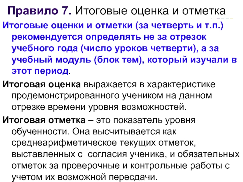 Слайд 34Итоговые оценки и отметки (за четверть и т.п.) рекомендуется определять не