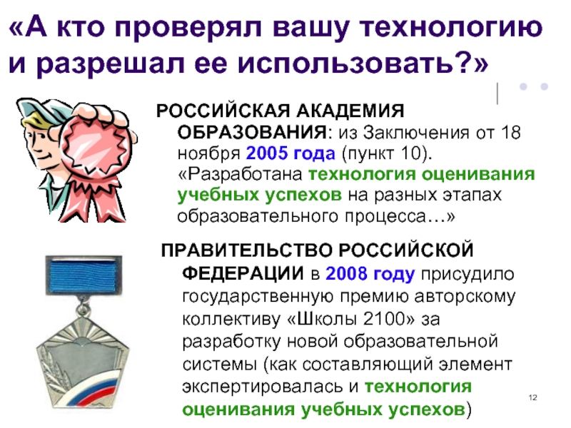 ПРАВИТЕЛЬСТВО РОССИЙСКОЙ ФЕДЕРАЦИИ в 2008 году присудило государственную премию авторскому коллективу «Школы 2100» за разработку новой образовательной системы (как составляющий элемент экспертировалась и технология оценивания учебных успехов)