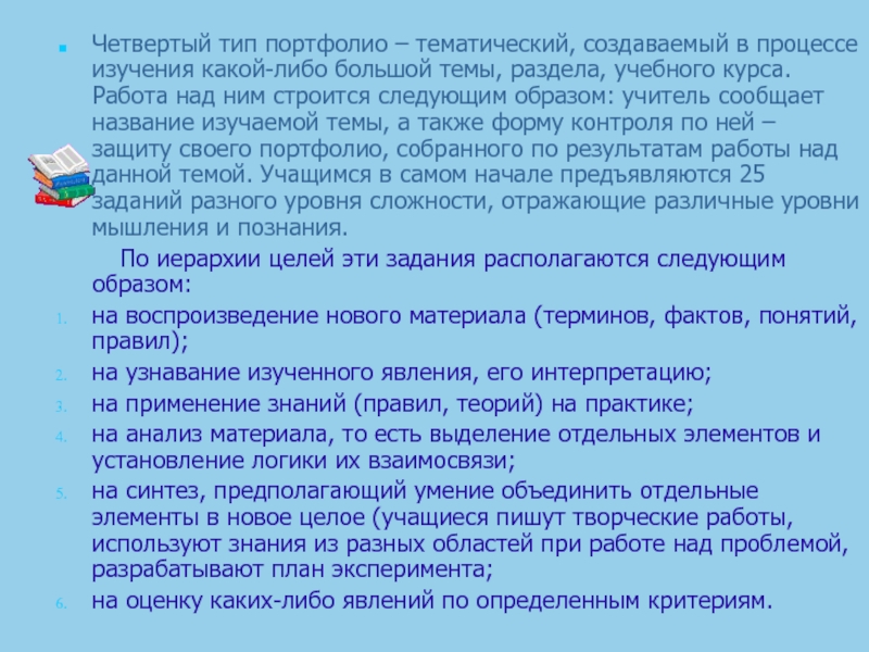 Слайд 7Четвертый тип портфолио – тематический, создаваемый в процессе изучения какой-либо большой
